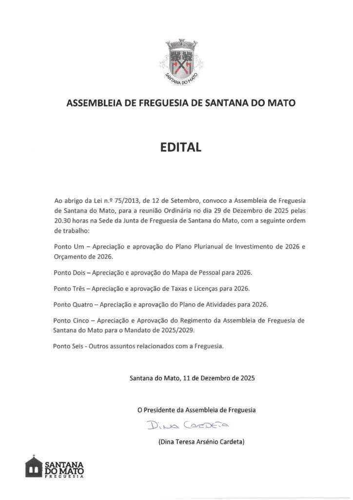 Edital nº 1 Horário das Sessões Ordinárias da Freguesia de Santana do Mato 2025